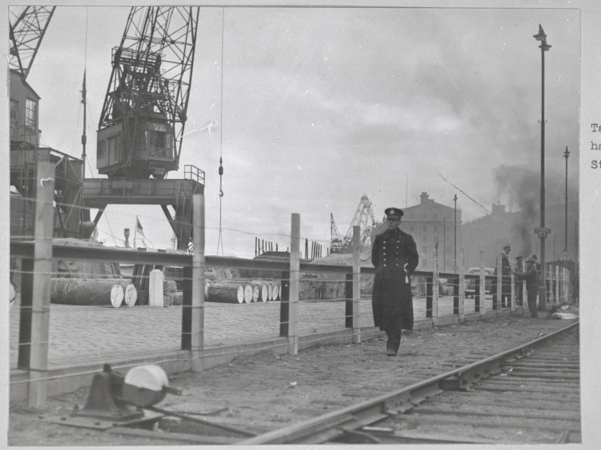 Polis patrullerar vid den avspärrade kajen vid Stadsgården, 24 oktober 1939.