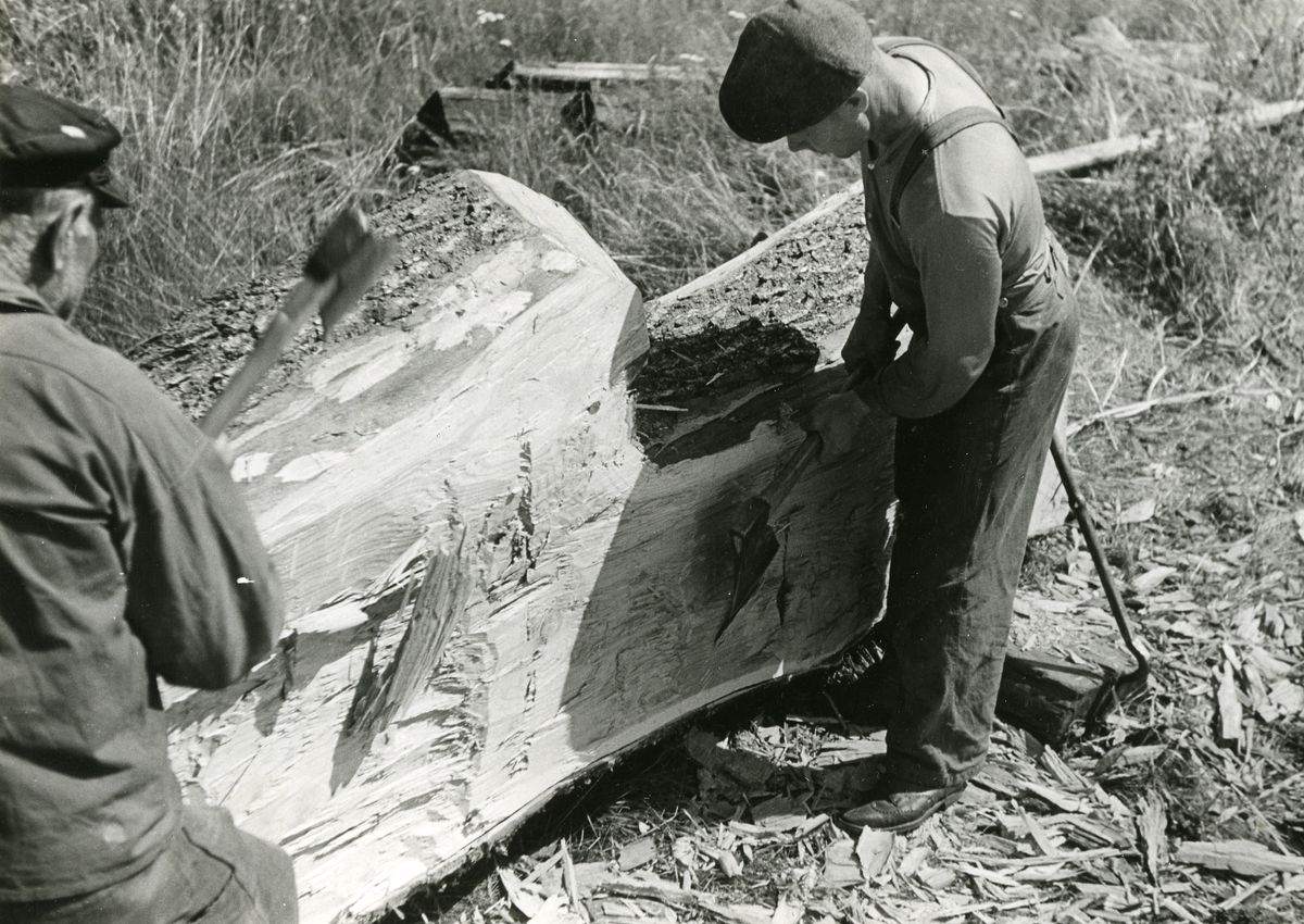 Skrädning av ekstock till akterstäv- "hjärtstock"- till isländsk fiskebåt under byggnad. Yxorna äro s.k. hjärtumsyxor, större typen. (se foto av sådan under Frihultstillverkningen).
