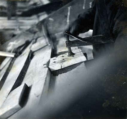 Fredrik Jonssons varv.En 30 fots klinkbåt under byggnad. Skarvlapp på ett bord fästes med skruvtving och klinkas.