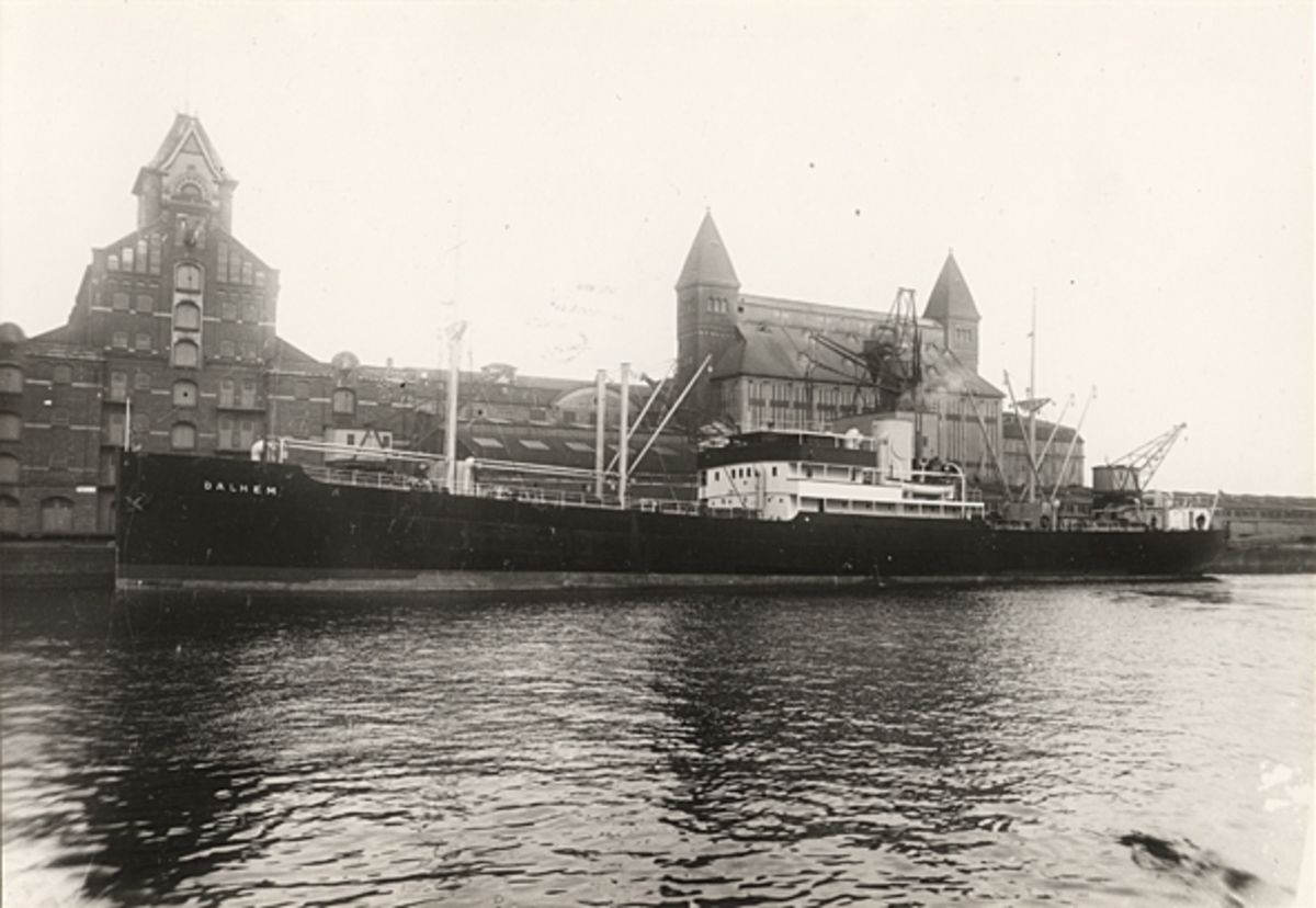 Foto i svartvitt visande lastmotorfartyget "DALHEM" av Slite i Köpenhamn.