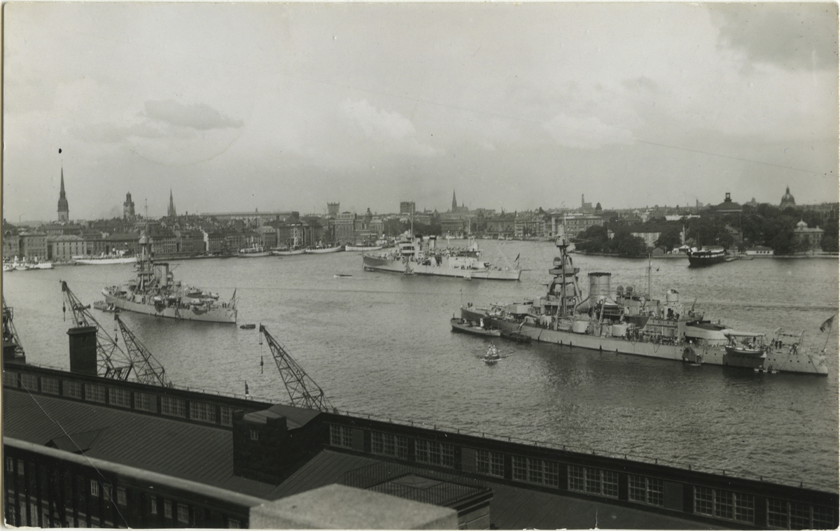 Eskaderbild tagen i maj 1934 då den amerikanska tunga kryssaren NEW ORLEANS (b. 1933, i bakgrunden i mitten) på sin "shakedown cruise" i nordeuropeiska hamnar besökte Stockholm. I förgrunden t h pansarskeppet GUSTAF V, t v SVERIGE. Förtöjt vid Skeppsholmen i bakgrunden t h logementsfartyget (ex ångfregatten) VANADIS (b. 1862).
