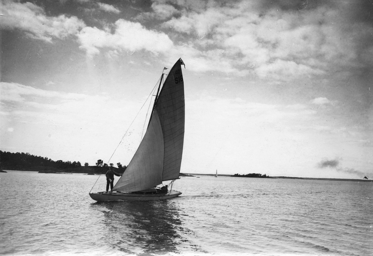 "Boja II leder med långt försprång vid Bullerö. Dist.segl. Saltsjöbaden-Sandhamn. Juni 12 1920." "b. 1918 i Gröndal K.E. Sjögren"