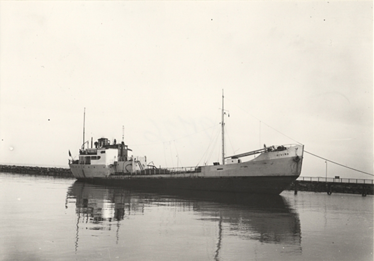 Foto i svartvitt visande tankmotorfartyget "DIVINA" i Köpenhamn.