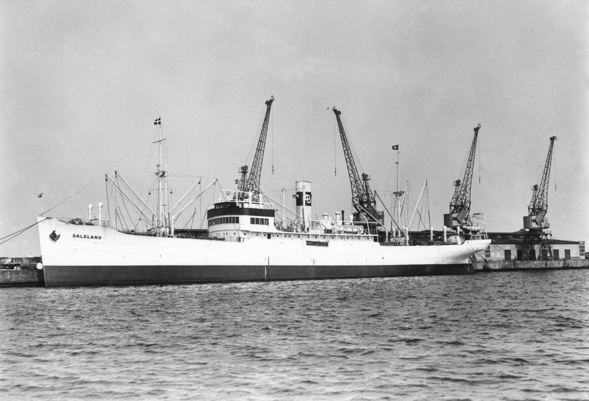Foto i svartvitt visande lastmotorfartyget "DALSLAND" i Köpenhamn någon gång under 1950-talet.