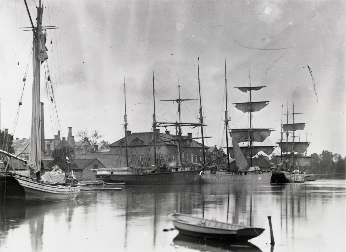 Gustavsbergs hamn. 3 st. 3-mast. skutor. Den grå, Alma av Väddö, framför Alma "Hoppet av Häverö".
