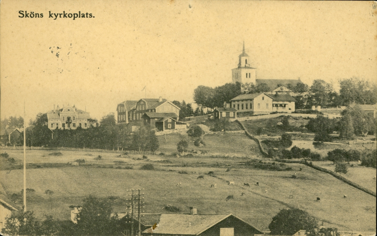 Vykort med motiv över Sköns kyrka med omgivning utanför Sundsvall.