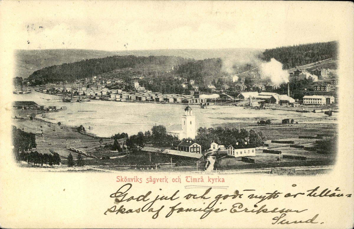 Vykort med motiv över Timrå kyrka och Skönviks sågverk.