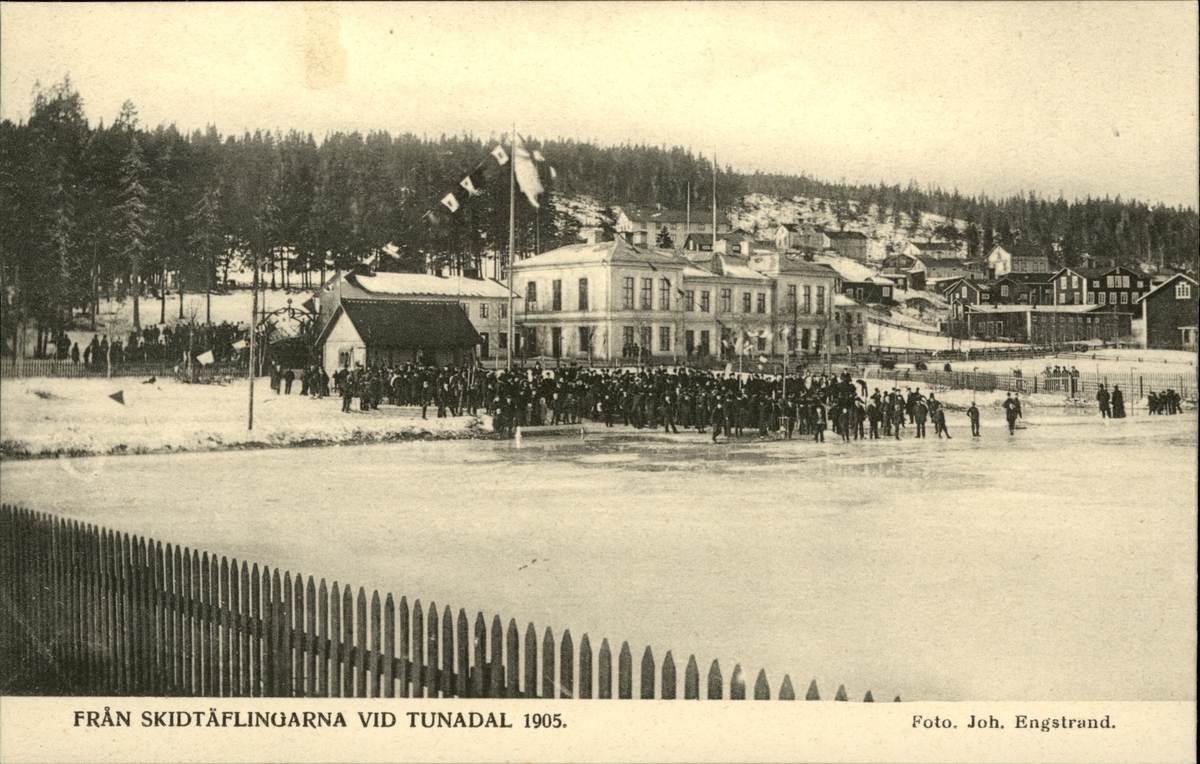 Vykort med motiv över skidtävlingarna vid Tunadal utanför Sundsvall.