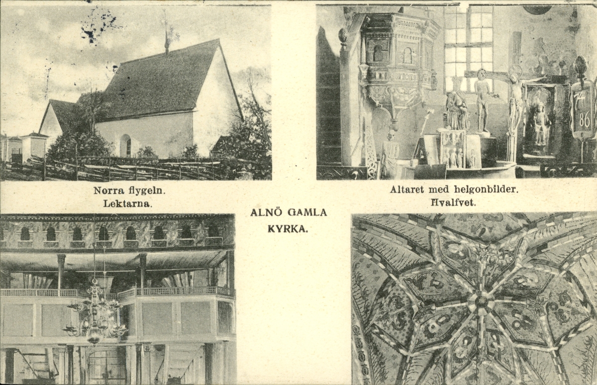 Vykort med motiv av norra flygeln, altaret, läktarna och valvet i Alnö gamla kyrka.