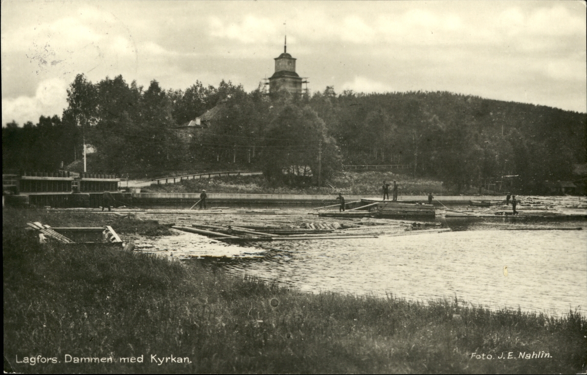 Vykort med motiv över dammen och kyrkan i Lagfors.