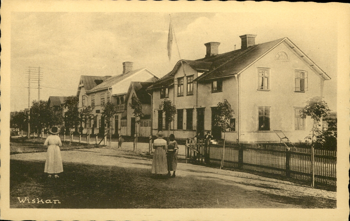 Vykort med motiv över en gata med bostadshus i Viskan.