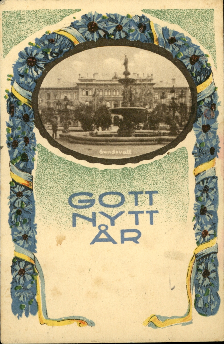 Vykort med motiv av en blomsterbåge som har en infälld bild av Vängåvan och med texten: Gott Nytt År.
