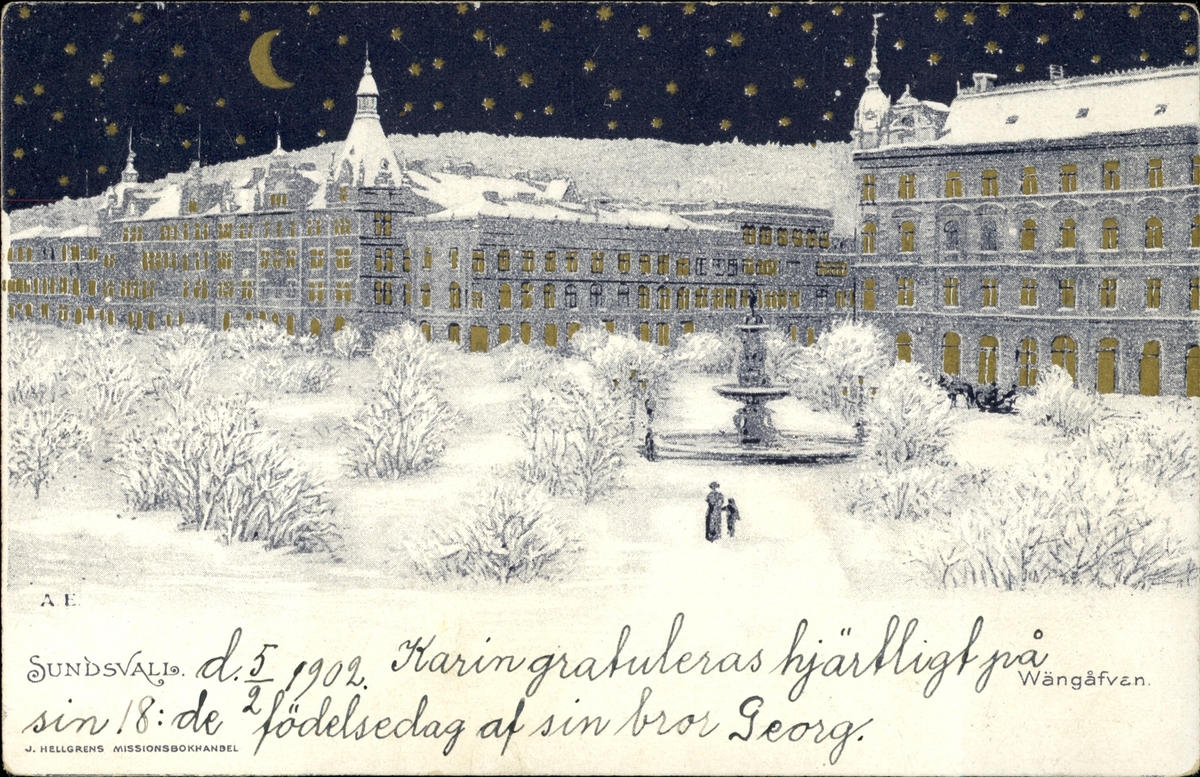 Vykort med vintermotiv över Vängåvan i Sundsvall.