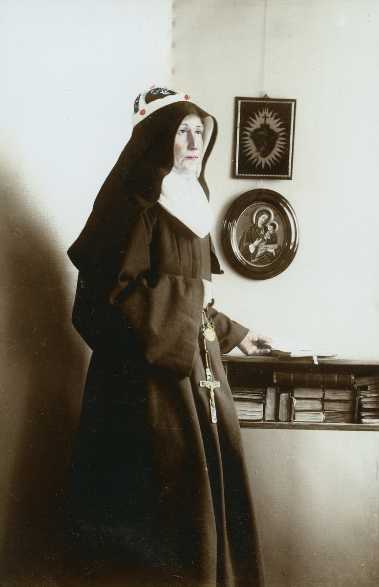 Kolorerat fotografi av en docka föreställande Charlotta Ehrenpohl. Född i Halmstad 1841 som dotter till Carl Adolf Ehrenpohl och dennes maka Sofia Lagergren. Från 1877 nunna vid birgittinklostret Maria Haart i Weert, Holland.