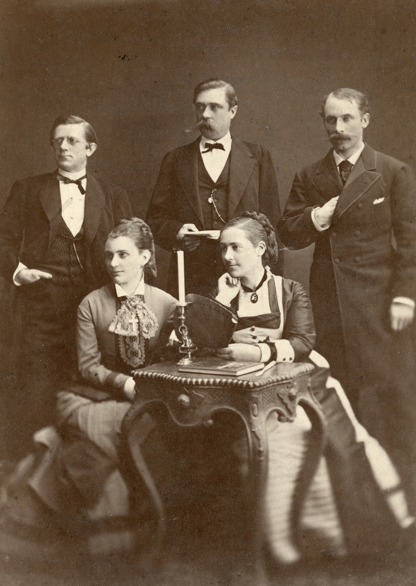 Grupporträtt i kabinettsformat från Maria Teschs ateljé i Linköping. Sittande vid bordet ser vi Ingeborg Jegerhjelm, född Nordvall och Sofia Ahnström, född Taube. Rakt bakom dessa står Ingeborgs make löjtnant Lars Gustaf Jegerhjelm omgiven av landskamrer August Lindencrona och löjtnant Georg Bagge. Tiden är omkring 1880.