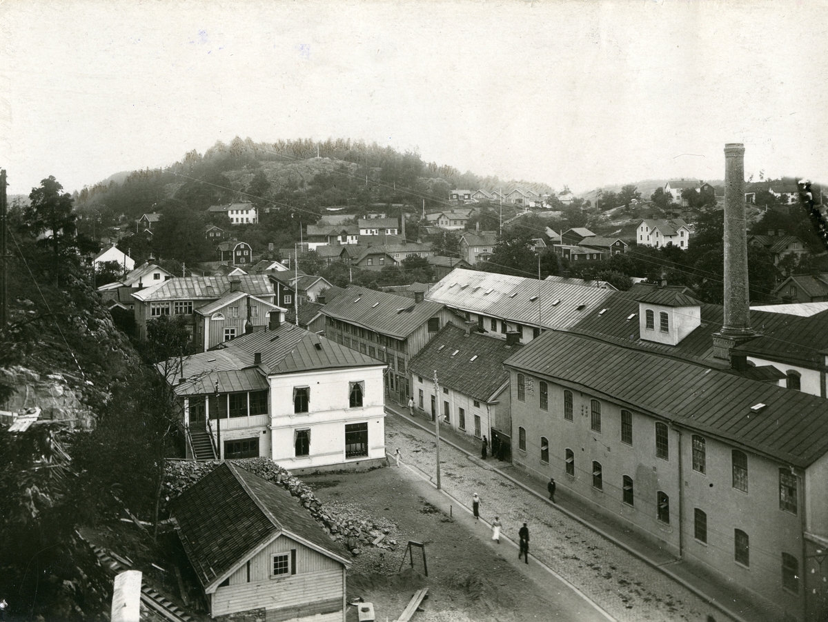 Parti av Valdemarsvik 1925. Närmast sträcker sig Lundbergs läderfabrik längs Garvaregatan.
