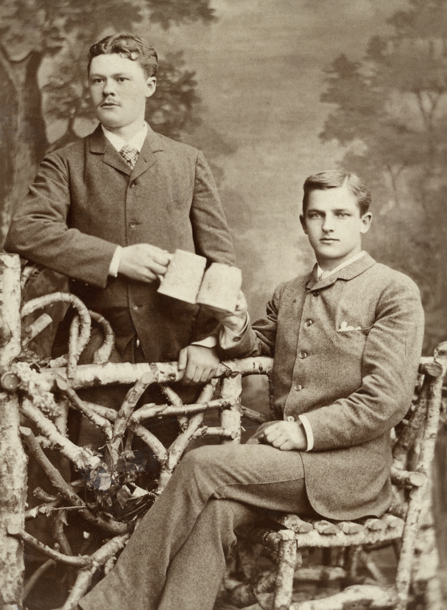 Kamratporträtt i ateljé med påfallande rustik dekor. John Svensson respektive Sven Hydén, jämnåriga vänner som till synes redan anträtt sina yrkesbanor inom bryggerinäringen. John sedermera disponent vid Linköpings Bryggeriaktiebolag, Sven detsamma vid S:t Eriks bryggeri i Stockholm.