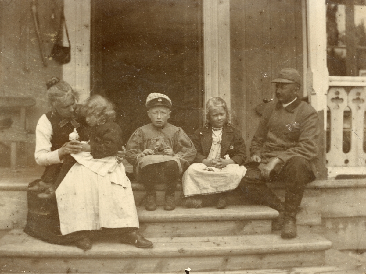 Medfaret porträtt av familjen Lundqvist sittandes på trappan till Korsnäs prästgård i Skällvik. Makarna Ammiel och Gertrud Lundqvist med barnen Margareta, Gösta och Maria. Ammiels föräldrar var kyrkoherdeparet på Korsnäs, Gustaf Leonard Lundqvist och Jaquette Ljunglöf. Fotografen är möjligtvis den fotointresserade kyrkoherden.