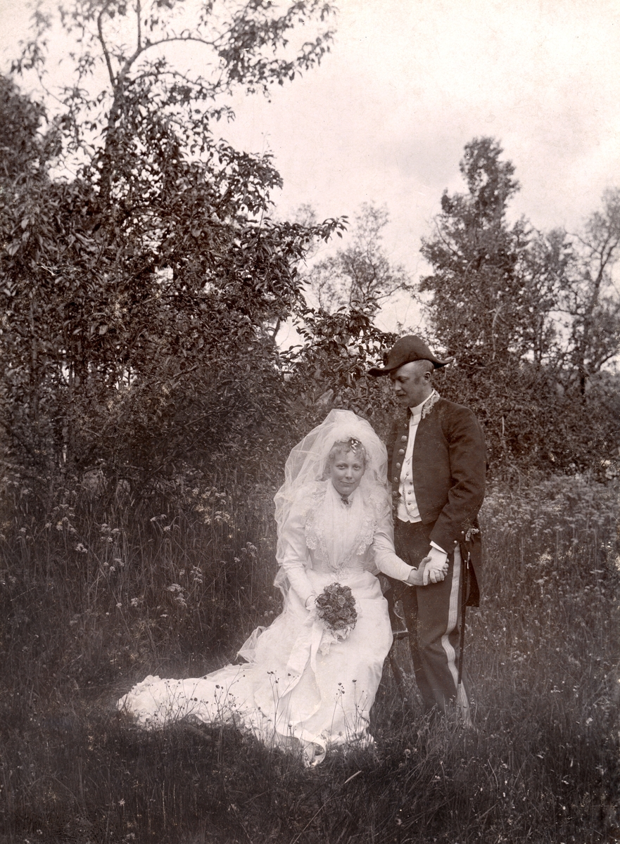 Bröllopsbild av Ammiel och Gertrud Lundqvist sommaren 1893. Bilden bär på en del mystik. Enligt påskrift är den tagen invid prästgården Korsnäs i Skällvik socken, men paret vigdes i Örebro. Hur som och måhända arrangerat ser vi ett vackert porträtt av sonen till kyrkoherden i Skällvik, Gustaf Leonard Lundqvist och makan Jacuette, född Ljunglöf. Bruden Gertrud var född Kjellström och bördig från just Örebro. Rimligtvis är det den fotointresserade kyrkoherden som tagit bilden.