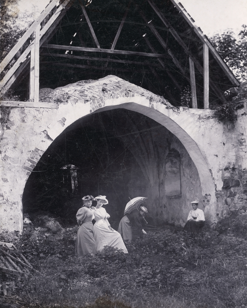 Några kvinnor besöker Sankt Anna kyrkoruin. Fotografen är möjligtvis den fotointresserade kyrkoherden i moderförsamlingen Skällvik, Gustaf Leonard Lundqvist.