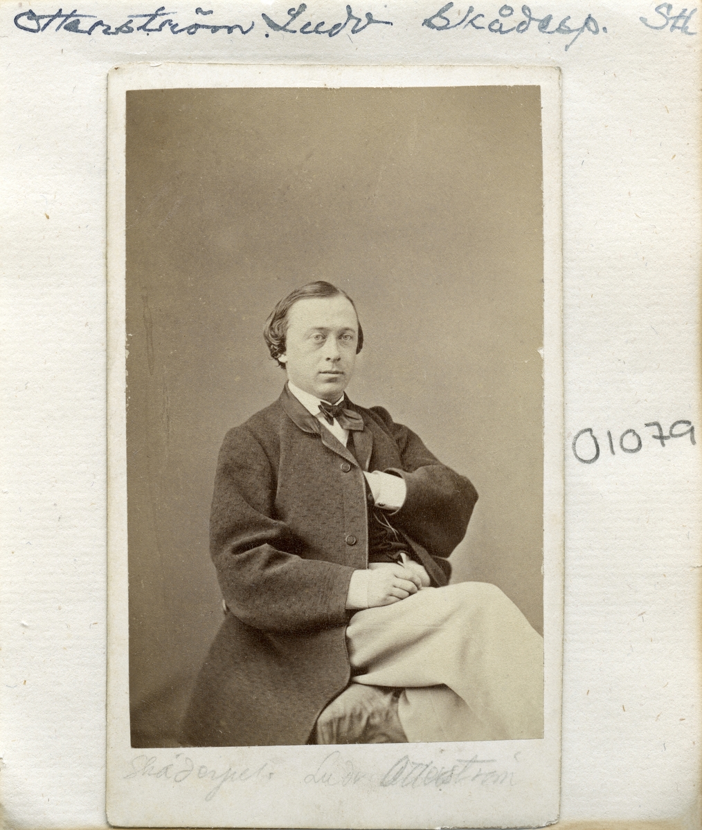 Porträtt av skådespelaren Ludvig Otterström. Under sin karriär knuten till Nya Teatern i Helsingfors, Mindre Teatern i Göteborg och Stockholm samt Djurgårdsteatern med flera. På arkets baksida återfinns en transkriberad hälsning till kapten Anton Ridderstad i Linköping.