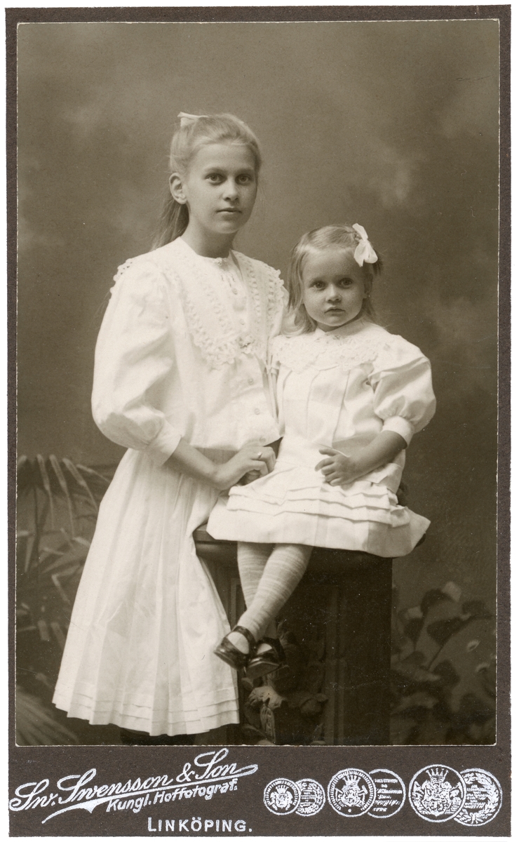 Porträtt av systrarna Hildur och Karin Eriksson. Syskonen var döttrar till makarna Erik och Lovisa Eriksson. Paret hade inflyttat till Linköping från Eskilstuna 1893. Familjen var bosatt i Tannefors där föräldrarna var kvarnägare och fadern etablerat rörelsen AB Erikssons Valskvarn.