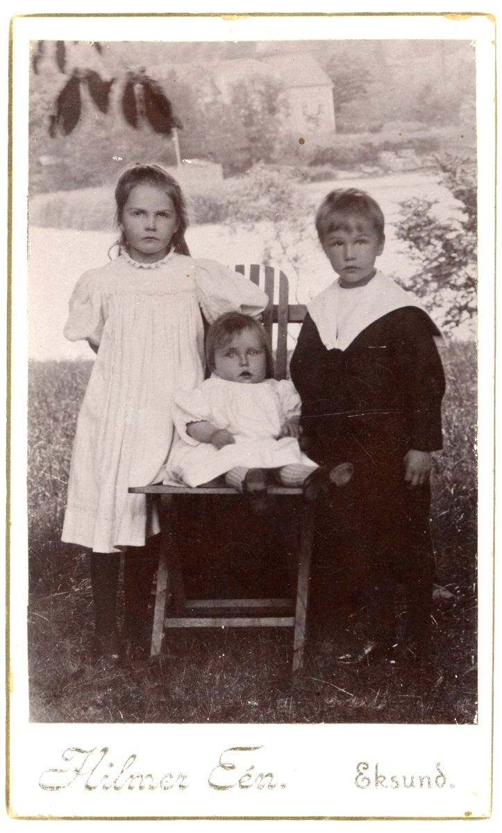 Syskonen Elsa, Märta och Henrik Falkenberg. Barn till makarna Carl Henrik Edvard Falkenberg (1855-1934) och Agnes Mathilda Charlotta Zielfelt (1866-1949). Familjen var vid tiden för bilden bosatt i Stockholm men kom inom kort att flytta sig i Vadstena. Fotografiet är rimligtvis taget i samband med barnens besök hos deras mormor Mathilda Sofia Godenius till Ribbingsholm i Kullerstad nära fotografens verksamhetsort Eksund.