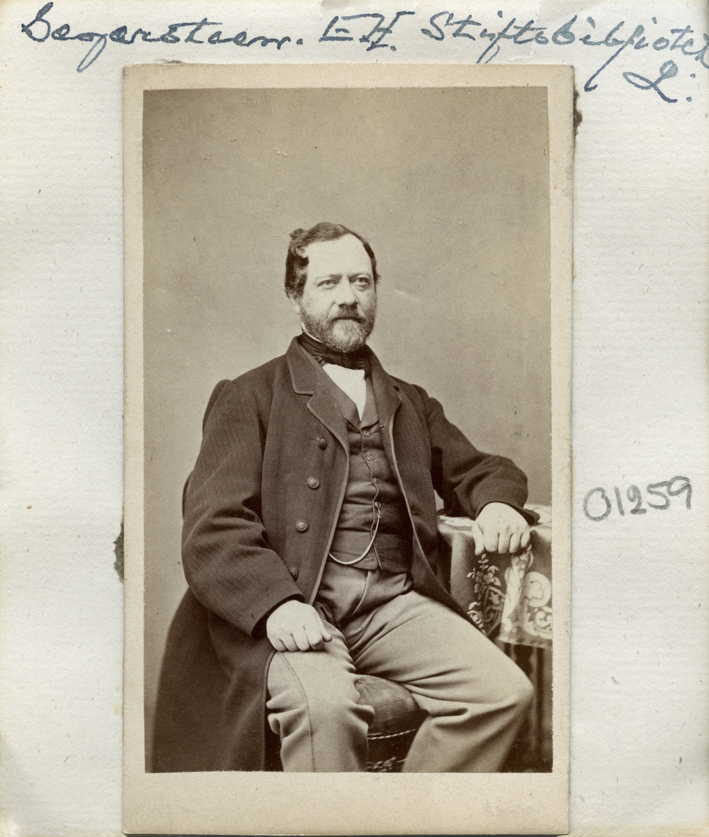 Porträtt av Erik Hjalmar Segersteen. Född i Torpa 1819 som son till fältprästen Anders Peter Segersteen och dennes maka Anna Sophia Norbeck. Efter studier i Lund kom Erik Hjalmar till Linköping 1859 för en tjänst som konsistorieamanuens, från vilken han vidare avancerade till ordinarie konsistorienotarie. År 1869 utsågs han parallellt med detta till stiftsbibliotikarie. Bibliotekets böcker var då ännu nödtorftigt samlade i domkyrkans torn men kunde från 1875 överflyttas till konsistoriehuset. Segersteen lade därefter ned stor möda på böckernas katalogisering. Längre fram, 1886, begärde Segesteen avsked från tjänsten som notarie och kunde lägga sin sista tid helt och fullt på sitt älskade bibliotek. Han avled i Linköping som ogift den 24 februari 1901.