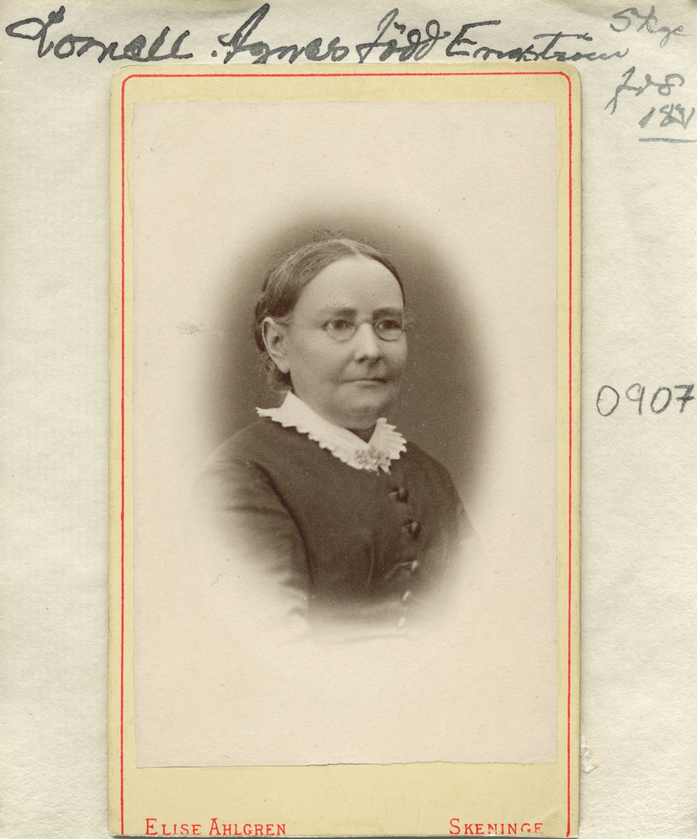 Porträtt av Agnes Lomell, född Engström. Från 1867 gift med färgaren, fabrikören och handlaren August Lomell. Efter att varit bosatta i Alingsås och Horn inflyttade makarna till Skänninge 1870. Där förblev de till makens bortgång 1886. Året därpå utvandrade Agnes till Amerika, dit äldste sonen tidigare flyttat.