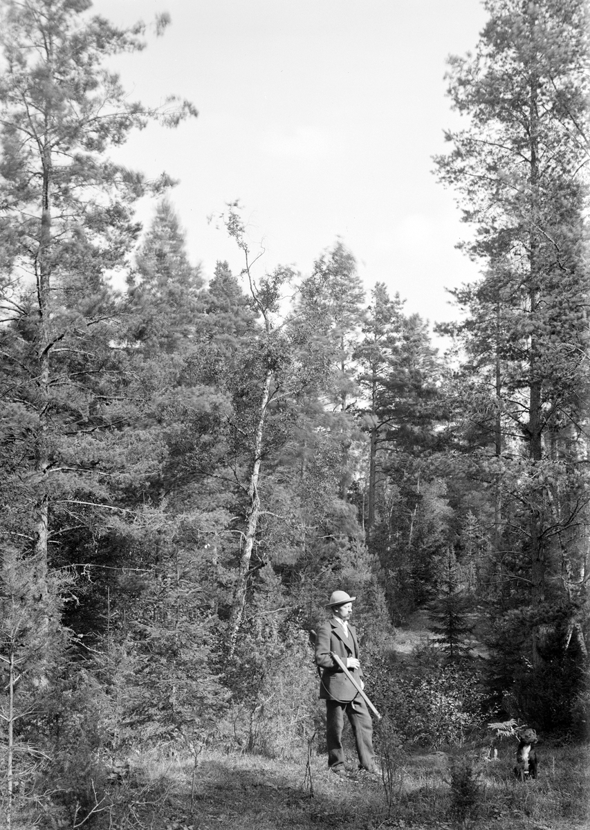 Musikern och kompositören Knut Bäck på jaktstråt i Hannässkogarna. Enligt efterlevande släktingar var han nu inte så mycket för jakt. Istället var det fotografering som i första hand intresserade honom och bössan hade han främst med för att undvika frågvishet. Här har han rimligtvis fått hjälp av sin fästmö Dagmar som förekommer på andra bilder i sammanhanget och paret befinner sig i trakten med orsak av att Knuts föräldrar vid tiden ägde Hägerstad slott i Hannäs socken.