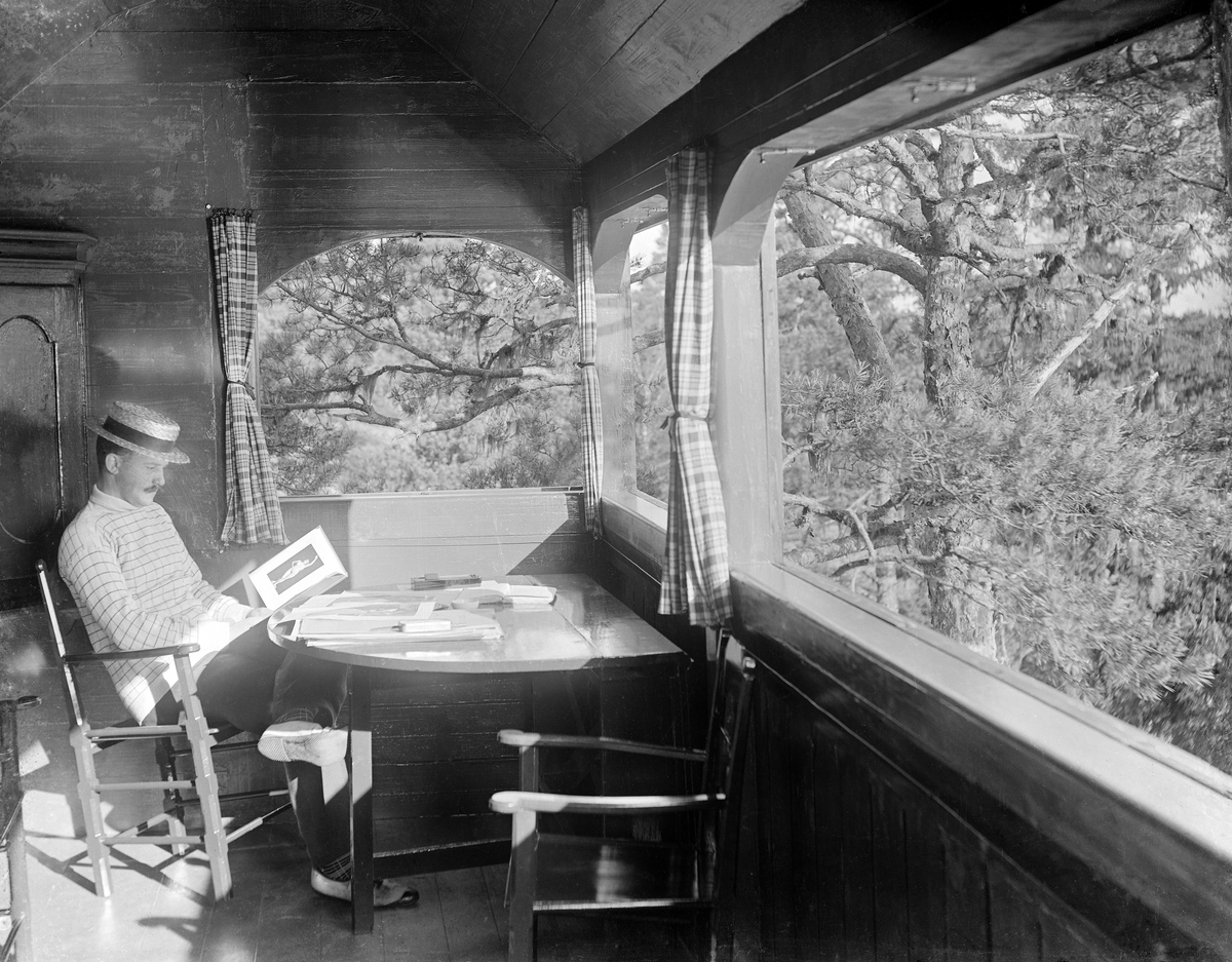 Arkitekten, ingenjören, tillika godsägaren Magnus Trysén förskjunken i studier. Platsen är verandan till hans sommarhus på Kvädölandet i Tryserum. Posten omfattar även en av Trysén handkolorerad kopia.