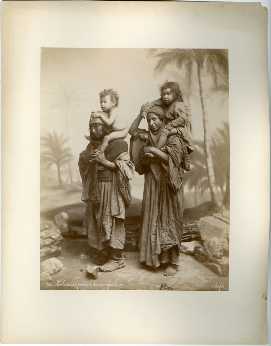 Porträtt av två kvinnor bärande två små barn. Ateljebild med bakgrund, kvinnorna är eller ska föreställa beduiner.