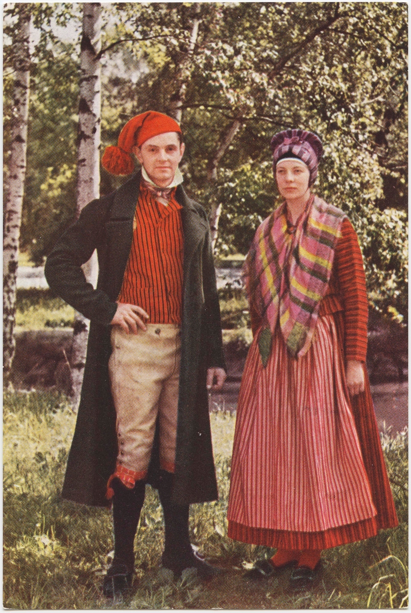 Vykort med motiv från Skansen. "Helgdagsdräkter. Sorunda socken, Södermanland."