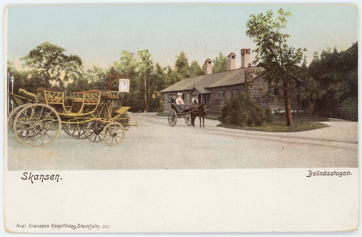 Titel: Vykort med motiv från Skansen. Bollnässtugan. Häst och vagn.