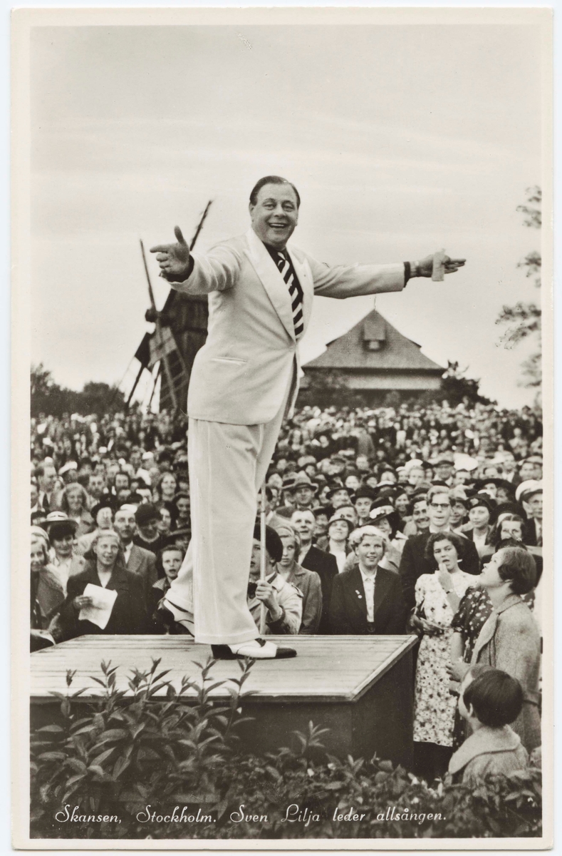 Titel: Vykort med motiv från Skansen. "Sven Lilja leder allsången."