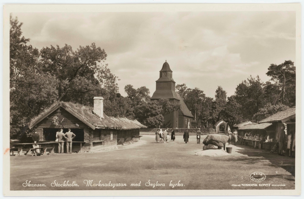Titel: Vykort med motiv från Skansen. "Marknadsgatan med Seglora kyrka"