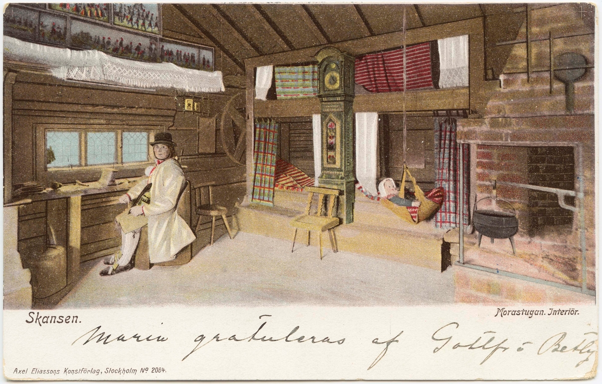 Vykort med motiv från Skansen. Morastugan, interiör.