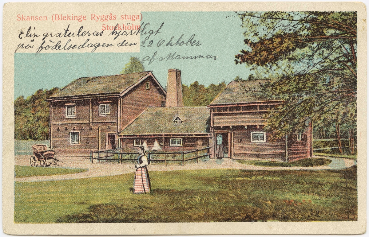 Titel: Vykort med motiv från Skansen. "Skansen (Belkinge Ryggås stuga) Stockholm". Kyrkhultsstugan
