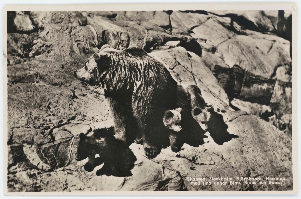 Vykort med motiv från Skansen. "Björnhonan Hermina med sina ungar Bims, Bams och Bums."