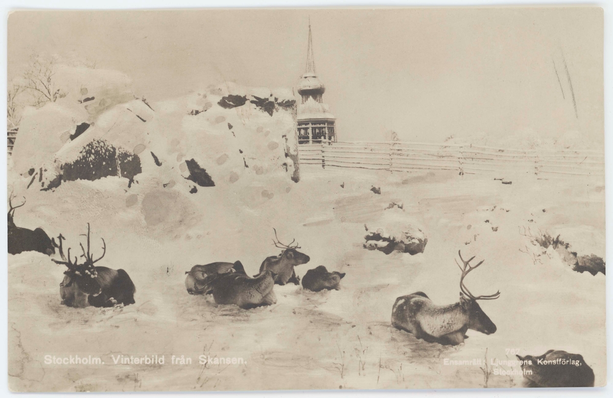 Vykort med motiv från Skansen. "Vinterbild från Skansen". Renar i snön, i bakgrunden Håsjöstapeln.