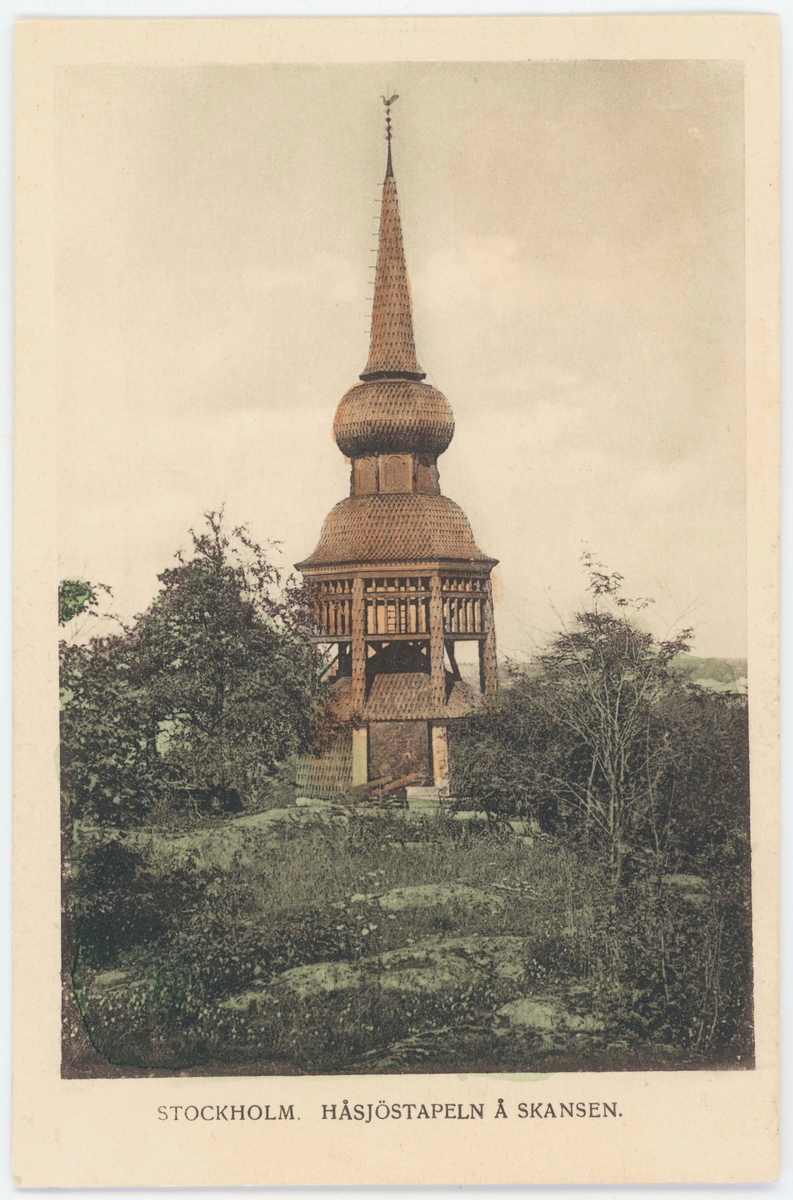 Titel: Vykort med motiv från Skansen. Håsjöstapeln. Kolorerat vykort.