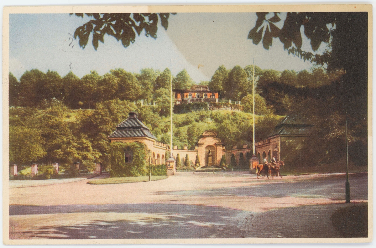 Vykort med motiv från Skansen. "Hazeliusporten, Skansen. Hazelius Gate to 'Skansen' Open Air Museum".