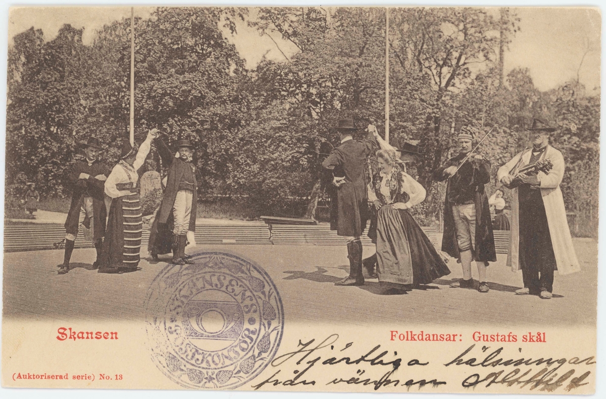 Titel: Vykort med motiv från Skansen. "Folkdansar: Gustafs skål"