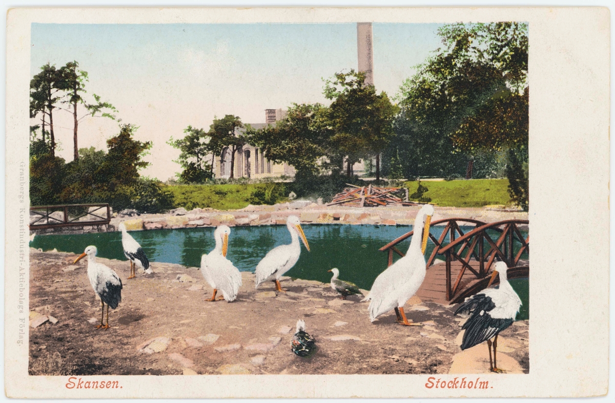 Titel: Vykort med motiv från Skansen. Fåglar vid damm.