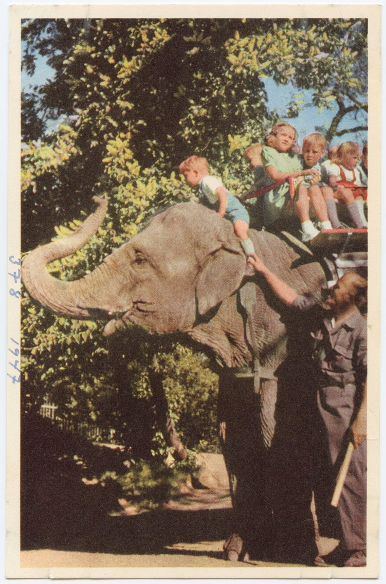 Titel: Vykort med motiv från Skansen. Barn som rider på elefanten Bambina.