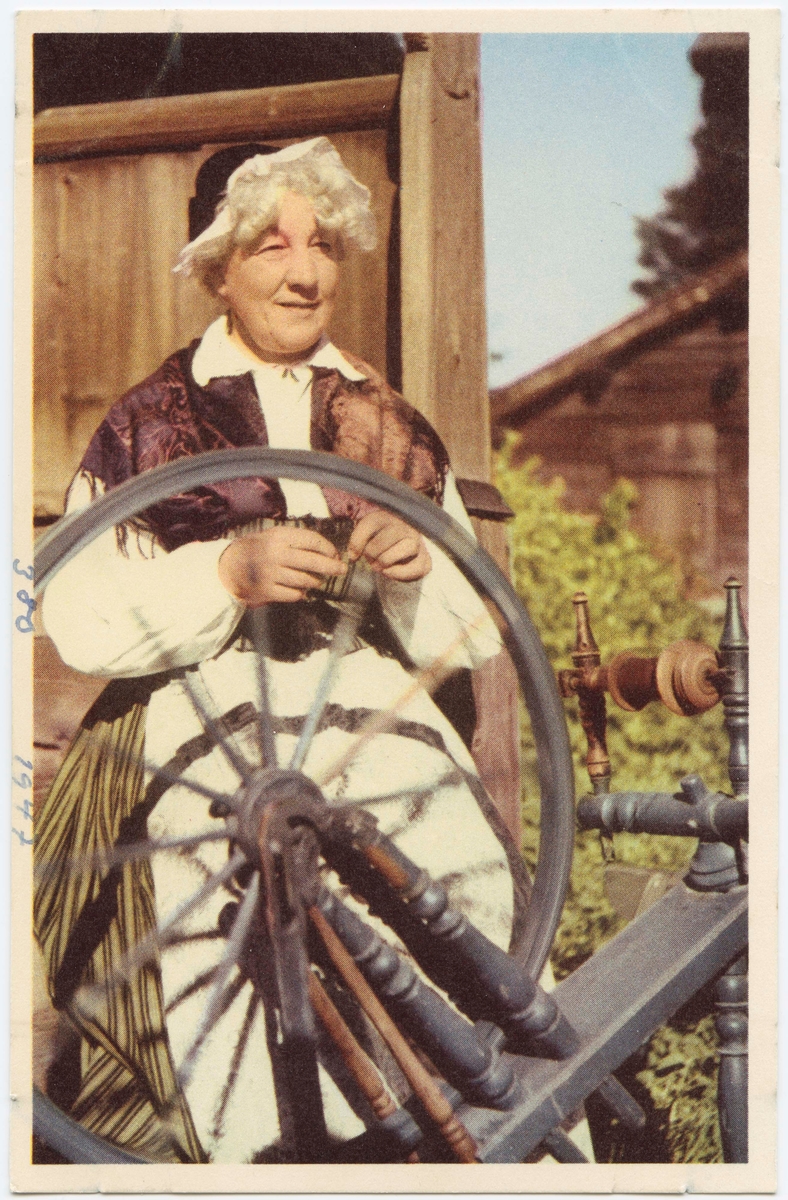 Vykort med motiv från Skansen. "Vid spinnrocken i Älvrosgården, Härjedalen."