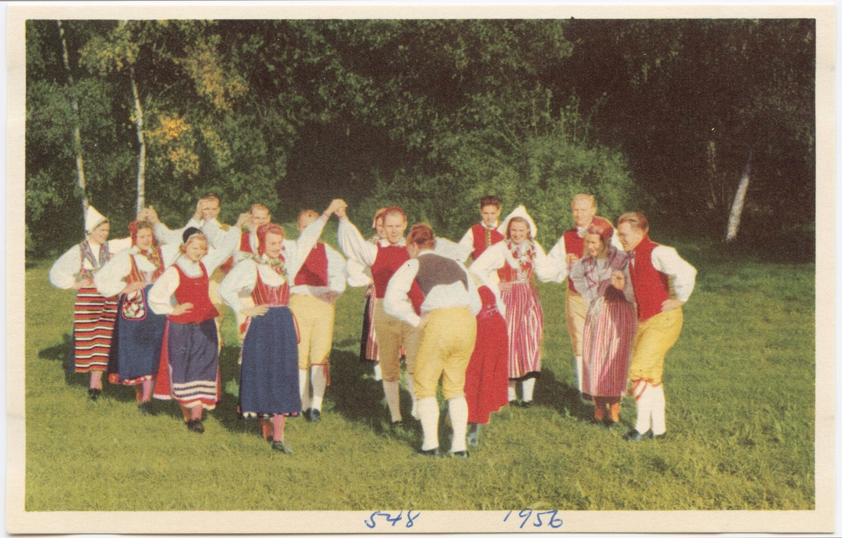 Titel: Vykort med motiv från Skansen. "Smålandspolska."