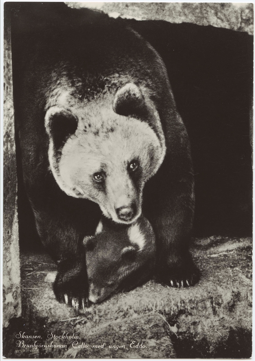 Titel: Vykort med motiv från Skansen. "Brunbjörnshonan Cello med ungen Eddo."