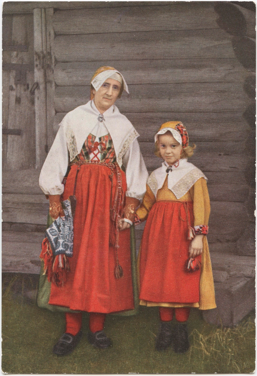 Vykort med motiv från Skansen. "Högtidsdräkter. Gagnefs socken, Dalarna. Vid Dalagården."