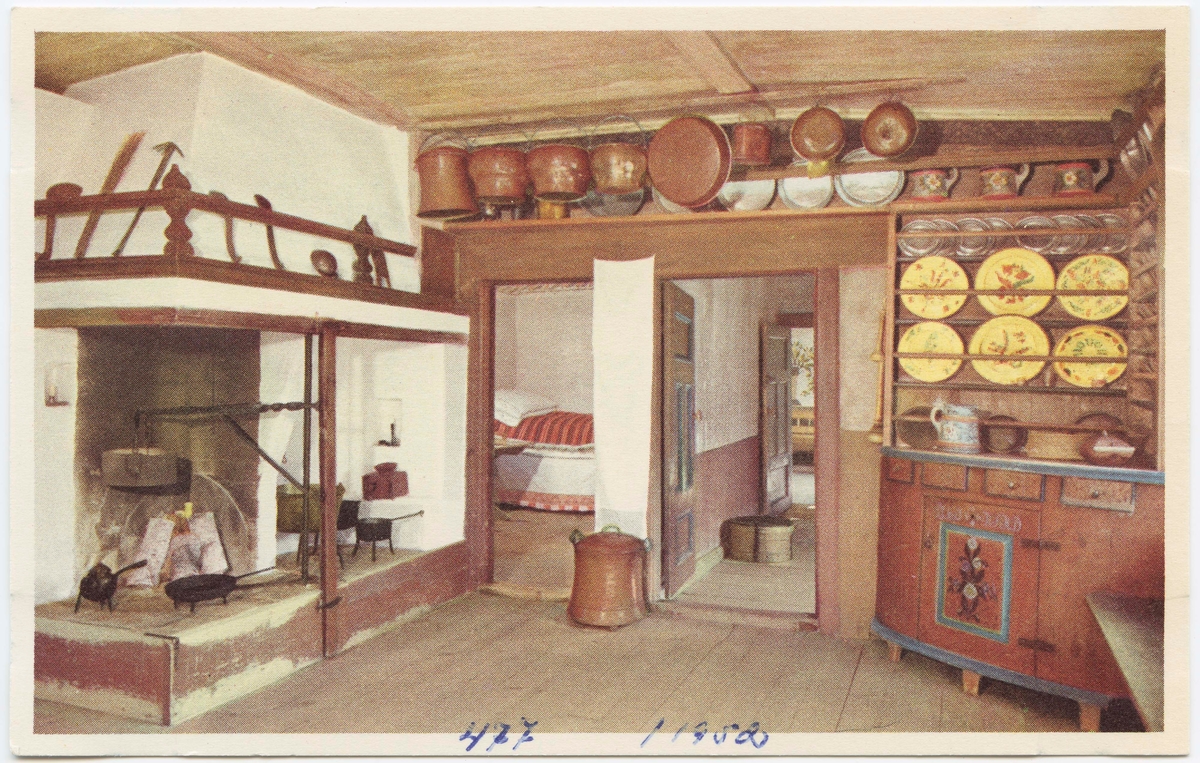 Vykort med motiv från Skansen. "Delsbogården från Hälsingland." Interiör från vardgasstugan i Västerängsstugan. Hörnskåp med tallrikshylla. Eldstad. Kopparföremål. Fat och tallrikar.